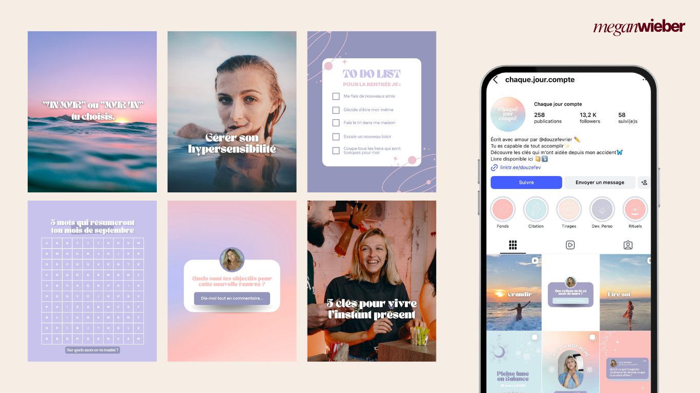 De 0 à 13,8k abonnés. Lancement digital réussi — univers cohérent, sensible et reconnaissable construit autour du livre. Communauté engagée et participative. Écho émotionnel fort autour du message du livre. Visibilité accrue et renforcement de la dimension "outil quotidien".